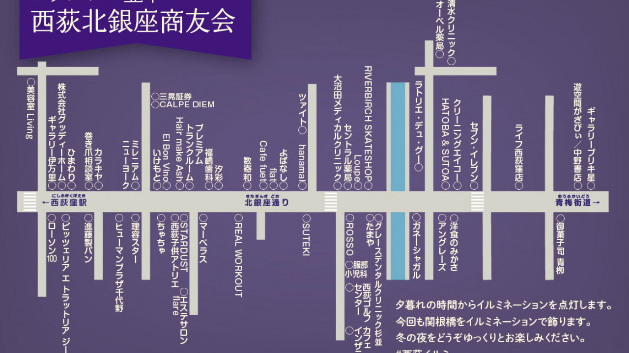 12月1日〜1月31日まで ・関根橋をライトアップ ・街路灯に電飾設置 ・西荻北銀座商友会加盟各店でそれぞれイルミネーション設置 夜の西荻をあたたかく照らします